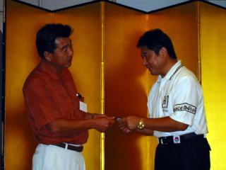 続いてJA5CJZ(笹さん)から新会員 へのバッチ進呈式が行われました。 まずはJH4TOX(神志那さん) (年齢順でしょうか?) |